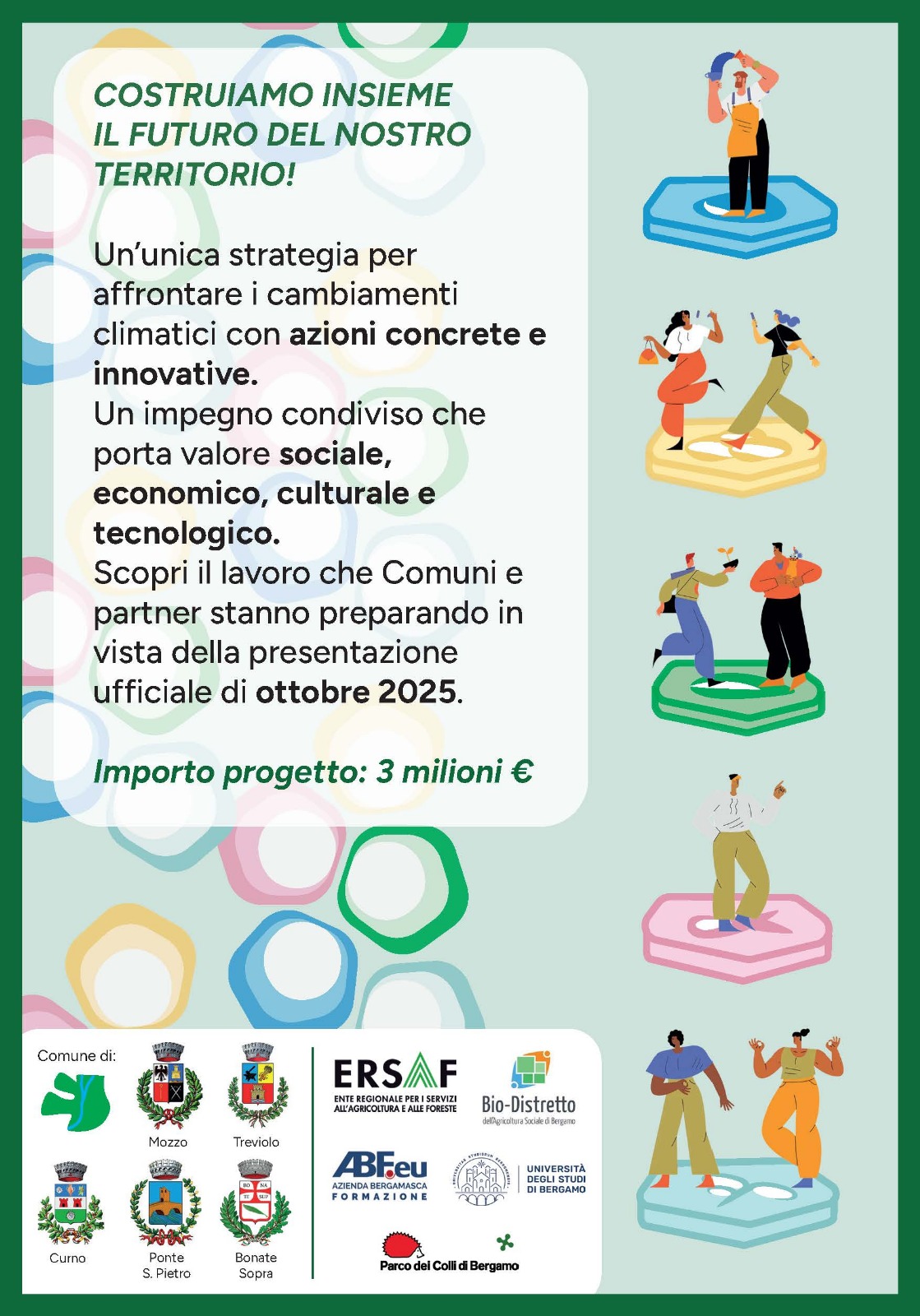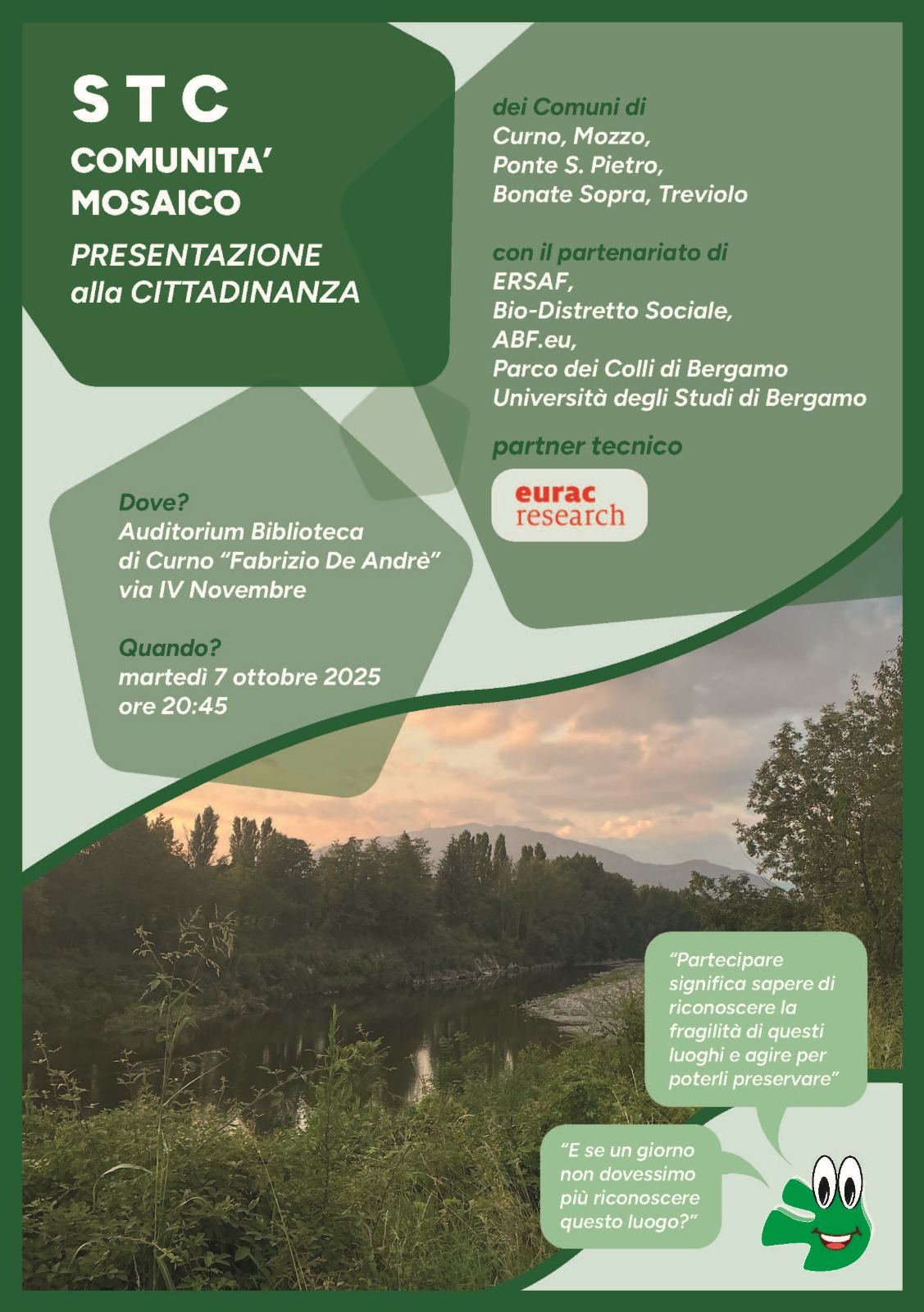 STC – Comunità Mosaico è costituito dai Comuni di Curno, Mozzo, Ponte San Pietro, Bonate Sopra e Treviolo, con il partenariato di ERSAF, Bio-Distretto Sociale, ABF.eu, Parco dei Colli di Bergamo e l’Università degli Studi di Bergamo.