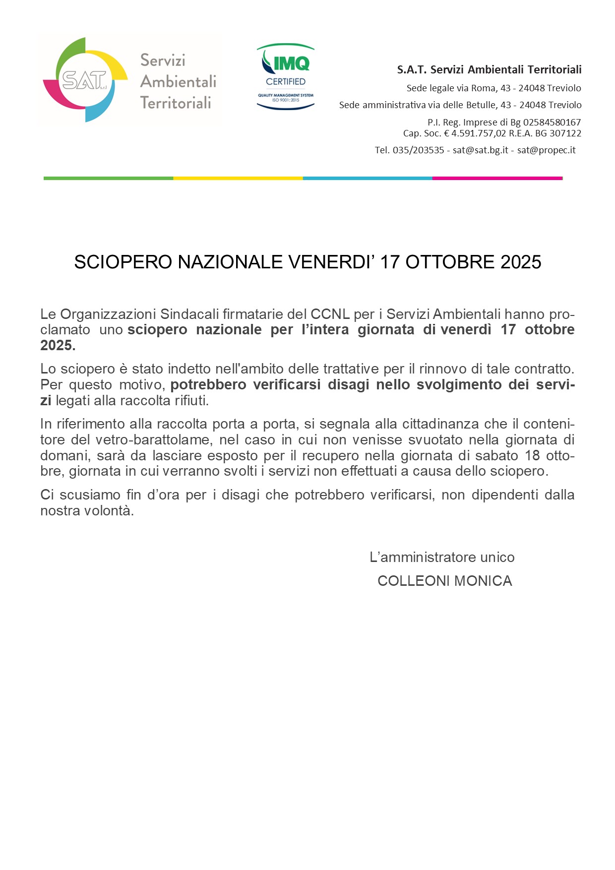 Si avvisano i gentili utenti che è stato proclamato uno sciopero nazionale per la giornata di venerdì 17 ottobre 2025.